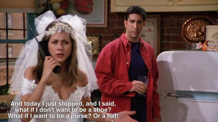 There’s an episode of Friends where Rachel, a run away bride on her wedding day, newly single and trying to find herself, dramatically declares, "It’s like all my life everyone’s always told me, ‘You’re a shoe! You’re a shoe! You’re a shoe!’ Well, what if I don’t want to be a shoe? What if I want to be a purse, or a hat?”